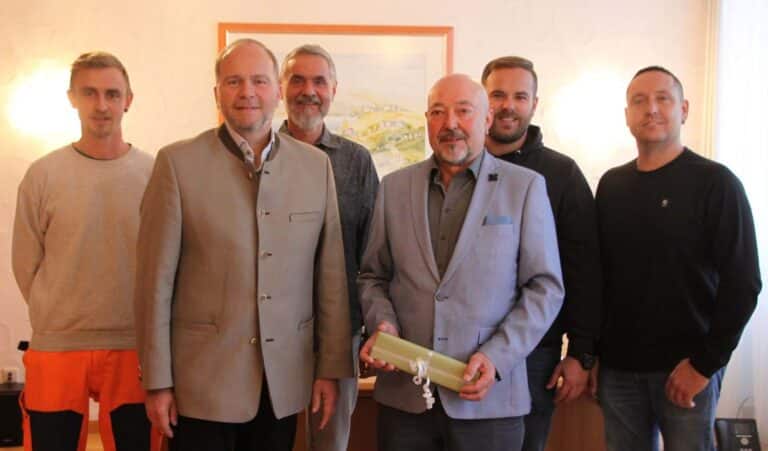 Mit Präsenten und den besten Wünschen für die Zukunft verabschiedeten Bauhofleiter Alexander Galle, Bürgermeister Bernd Reisenweber, Geschäftsleiter Stefan Kemnitzer, Personalsachbearbeiter Patrick Vogt und Personalratsvorsitzender Sandro Köhler-Terz (v.l.) Alexander Schamberger in den Ruhestand.