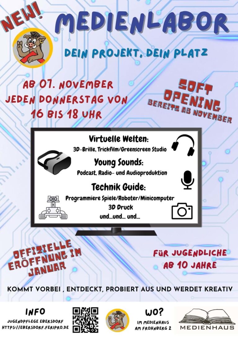 Das Medienlabor im gemeindlichen Medienhaus Ebersdorf, Am Frohnberg 2, ist ein innovatives Angebot der Jugendpflege Ebersdorf für Jugendliche ab 10 Jahren. In einem technisch modern ausgestatteten Raum können die Jugendlichen kreative und mediale Fähigkeiten entwickeln und ausleben. Ziel ist die Förderung von Medienkompetenz, sozialer Zusammenarbeit und die Unterstützung der Selbstwirksamkeit der Teilnehmenden.