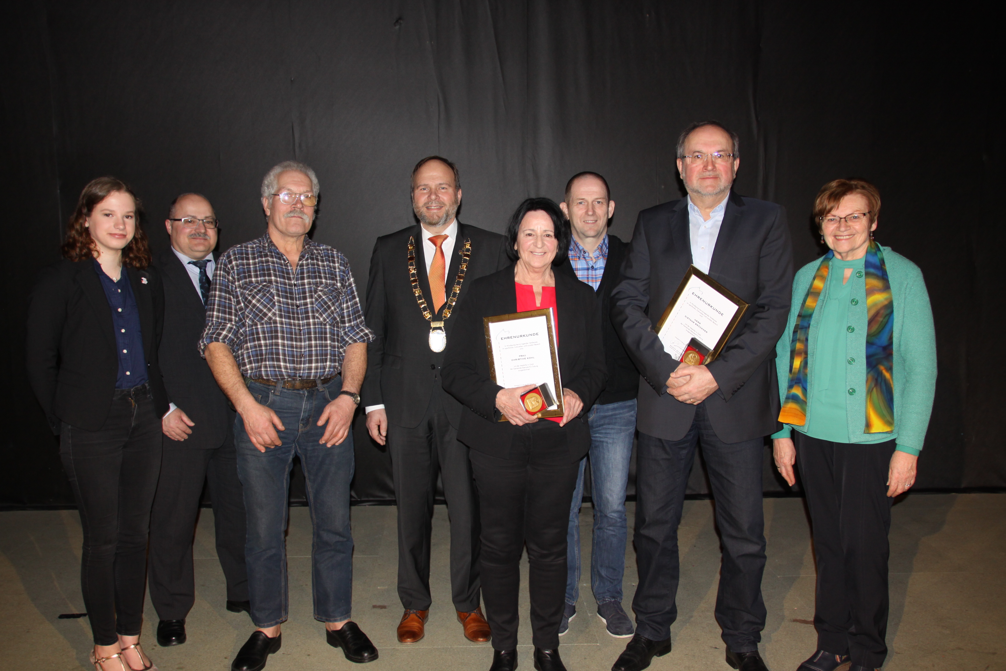 Meldung vom 29.02.2020 Christine Kohl, Felix Enz, Dietmar Brückner, die 4er Junioren Kunstradmannschaft des RSV Frohnlach und die 1. Luftpistolen-Mannschaft der Schützengesellschaft Ebersdorf wurden mit der Medaille in Gold der Gemeinde Ebersdorf b.Coburg für besondere Verdienste im sportlichen und kulturellen Bereich dekoriert.