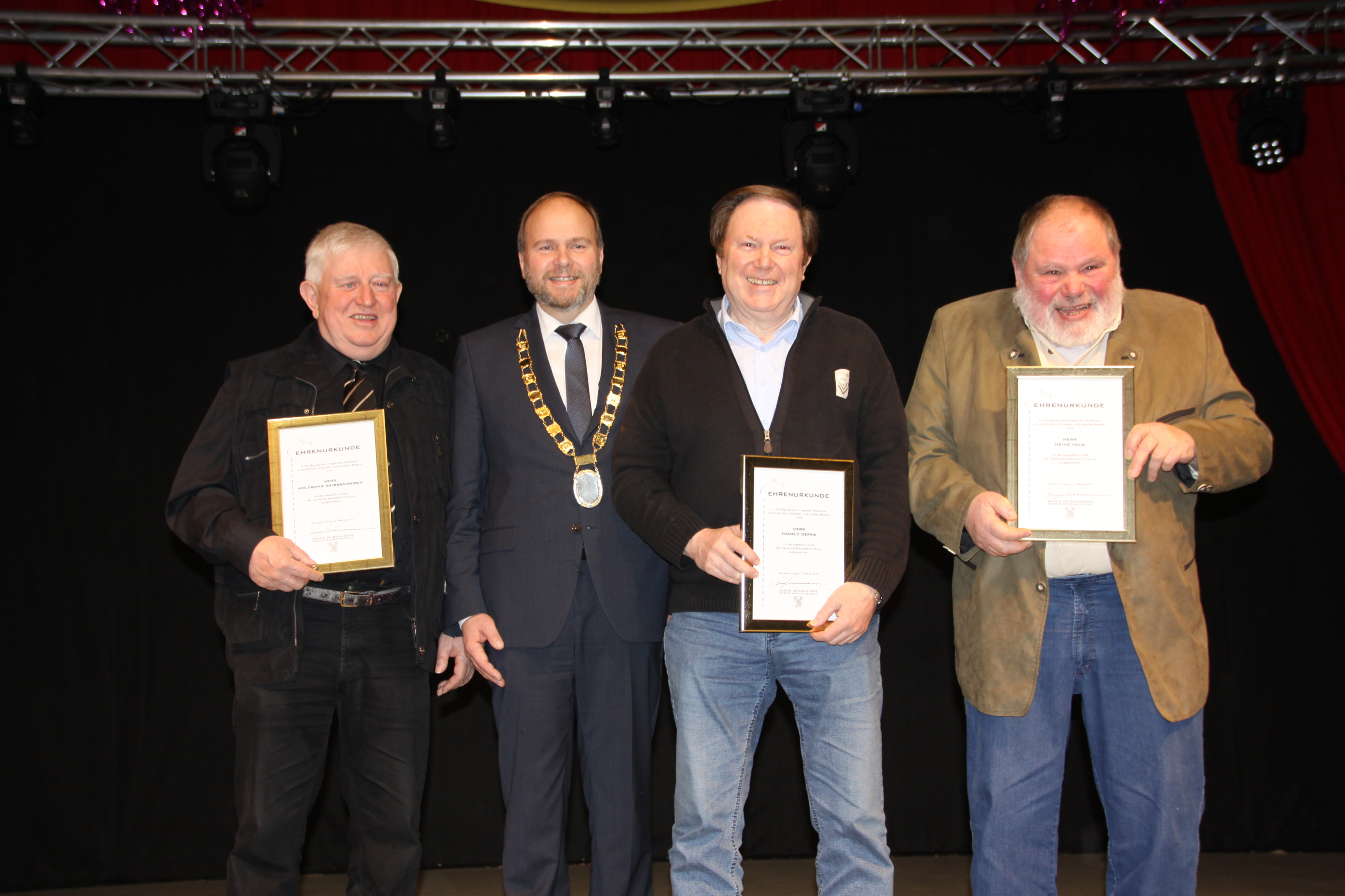 Mit der Medaille in Gold für besondere Verdienste im sportlichen und kulturellen Bereich wurden dieses Jahr zum einen drei Herren ausgezeichnet, die in ihren Vereinen seit etlichen Jahrzehnten aktiv sind. So hat Harald Derks schon mit 14 Jahren seine Leidenschaft zum Hundesport entdeckt und ist mittlerweile seit 50 Jahren im Hauptverein der Schäferhundezüchter und seit stolzen 43 Jahren Mitglied der Ortsgruppe Ebersdorf. Aufgrund seines großen Erfahrungsschatzes übt er dort seit 18 Jahren das Amt des Zuchtwarts aus. In dieser Zeit präsentierte er auf Landesgruppen- und Hauptzuchtschauen nicht nur seine eigenen Hunde sehr erfolgreich. Zudem kam Harald Derks als Prüfungs- und Wettkampfleiter, sowie als Schutzdiensthelfer zum Einsatz. Auch um die Nachwuchsförderung kümmert er sich mit Rat und Tat, sowie speziellen Trainingseinheiten. Mit seinen Glückwünschen verband Bürgermeister Bernd Reisenweber auch das Lob des Vereins für Deutsche Schäferhunde „Harald ist kein Genie - aber mit Sicherheit ein Paket voller Erfahrungen“.