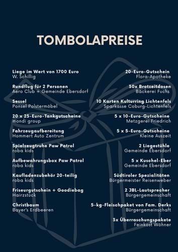 Meldung vom 18.10.2025 Da die Weihnachtszeit ja auch die Zeit des Freudeschenkens ist, wollen wir das auch bei der Ebersdorfer Weihnacht tun – und zwar gleich doppelt, nämlich in Form einer Tombola: Eine Tombola, bei der zum einen den Los-Käufern in Form eines möglichen Gewinns eine Freude bereitet wird, zum anderen aber auch denjenigen, die Unterstützung brauchen, da der Erlös aus dem Los-Verkauf direkt in die Bürgerstiftung fließt. Lose für die Tombola können Sie am Kirchweihmarkt am Stand der Gemeinde erwerben und ansonsten im Rathaus, während der Öffnungszeiten.