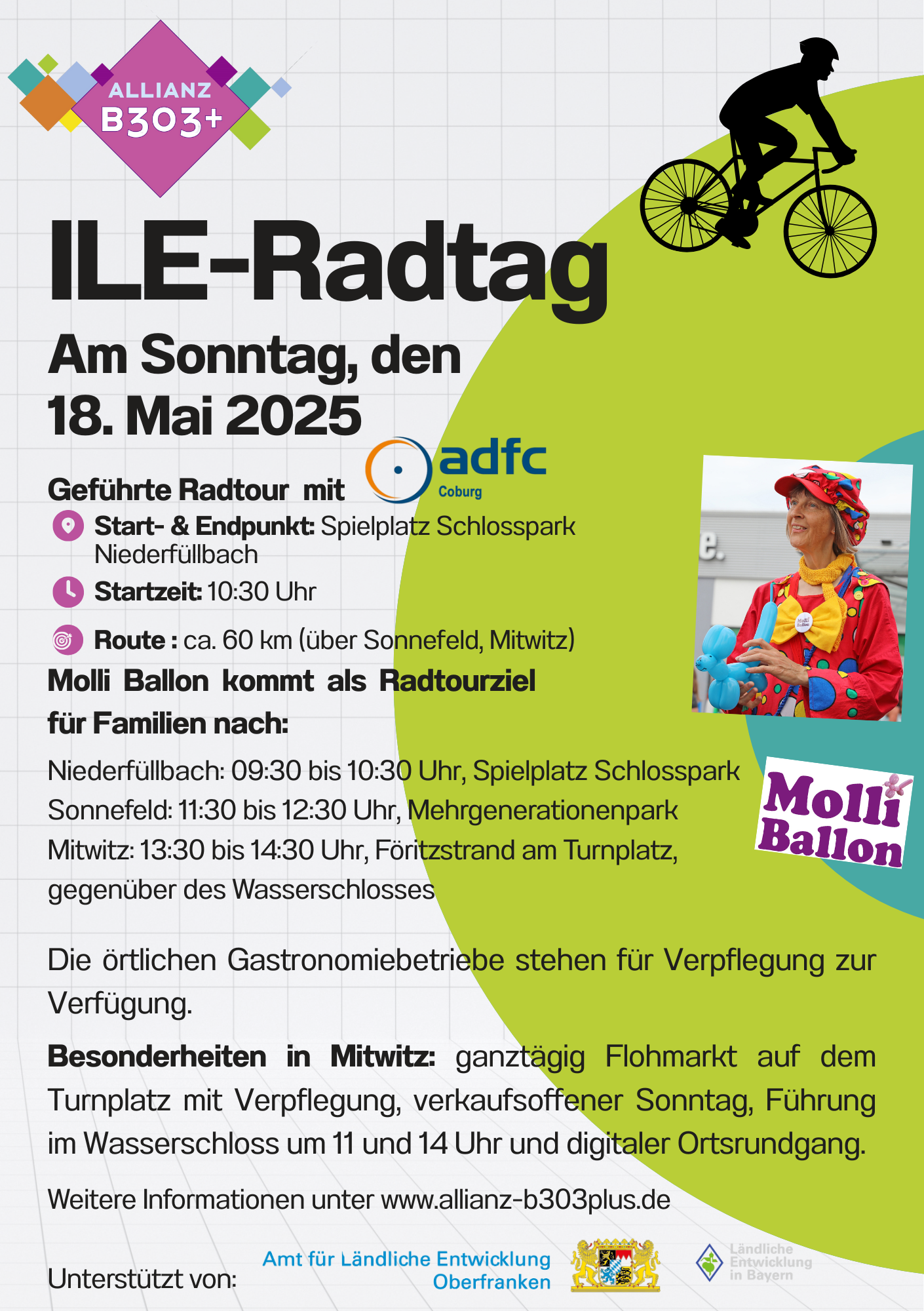 Dafür kann der Allianzradweg genutzt werden, oder kleinere Strecken im ILE-Gebiet gefahren werden. Es gibt eine geführte Radtour von Niederfüllbach über Sonnefeld nach Mitwitz und zurück. Molli Ballon kommt auf drei Spielplätze, um den Familien ein lohnenswertes Ziel zu bieten.