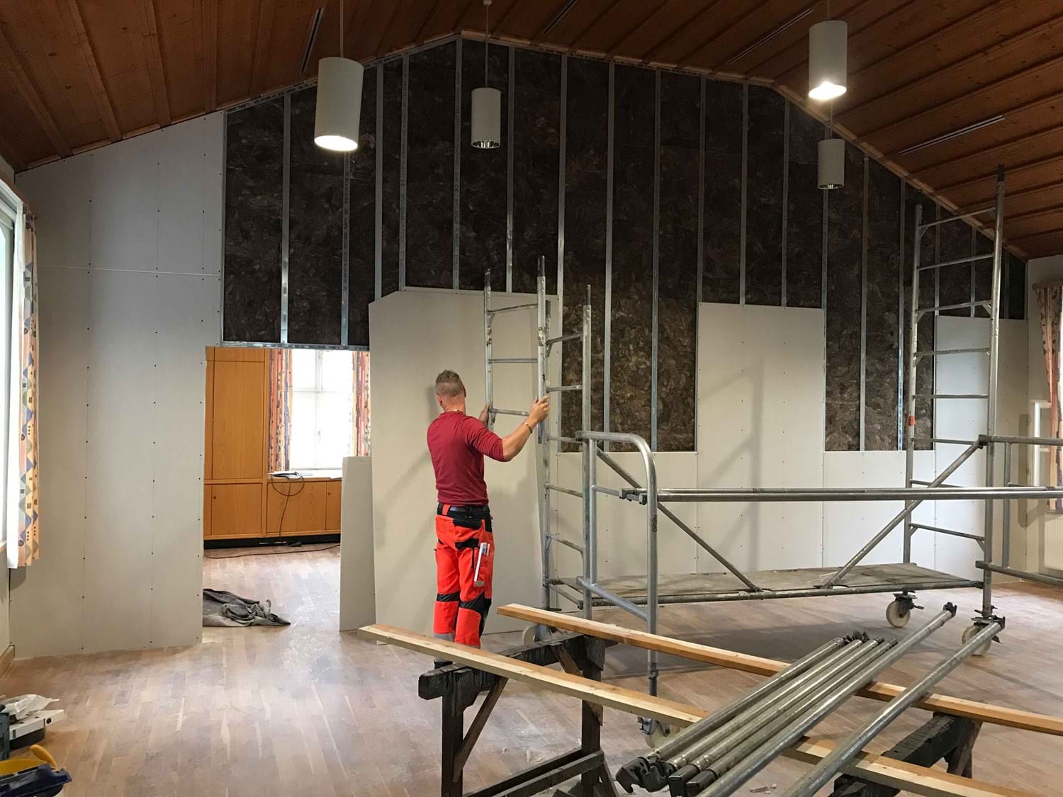 In Rekordzeit von gut acht Wochen wurde das Wankhaus zum Landkindergarten umgebaut. Dafür wurde eine Trockenbauwand installiert, die den Saal in einen kleineren Ruhebereich im hinteren Teil und einen Aufenthaltsbereich im größeren vorderen Teil, trennt. Anschließend wurden der Flur- und Treppenbereich kindersicher gemacht und einige Umbauarbeiten in den Toilettenanlagen durchgeführt. Nach dem Umzug des Landkindergartens in den Neubau in der ehemaligen Schule, werden diese Einbauten selbstverständlich wieder rückgebaut.