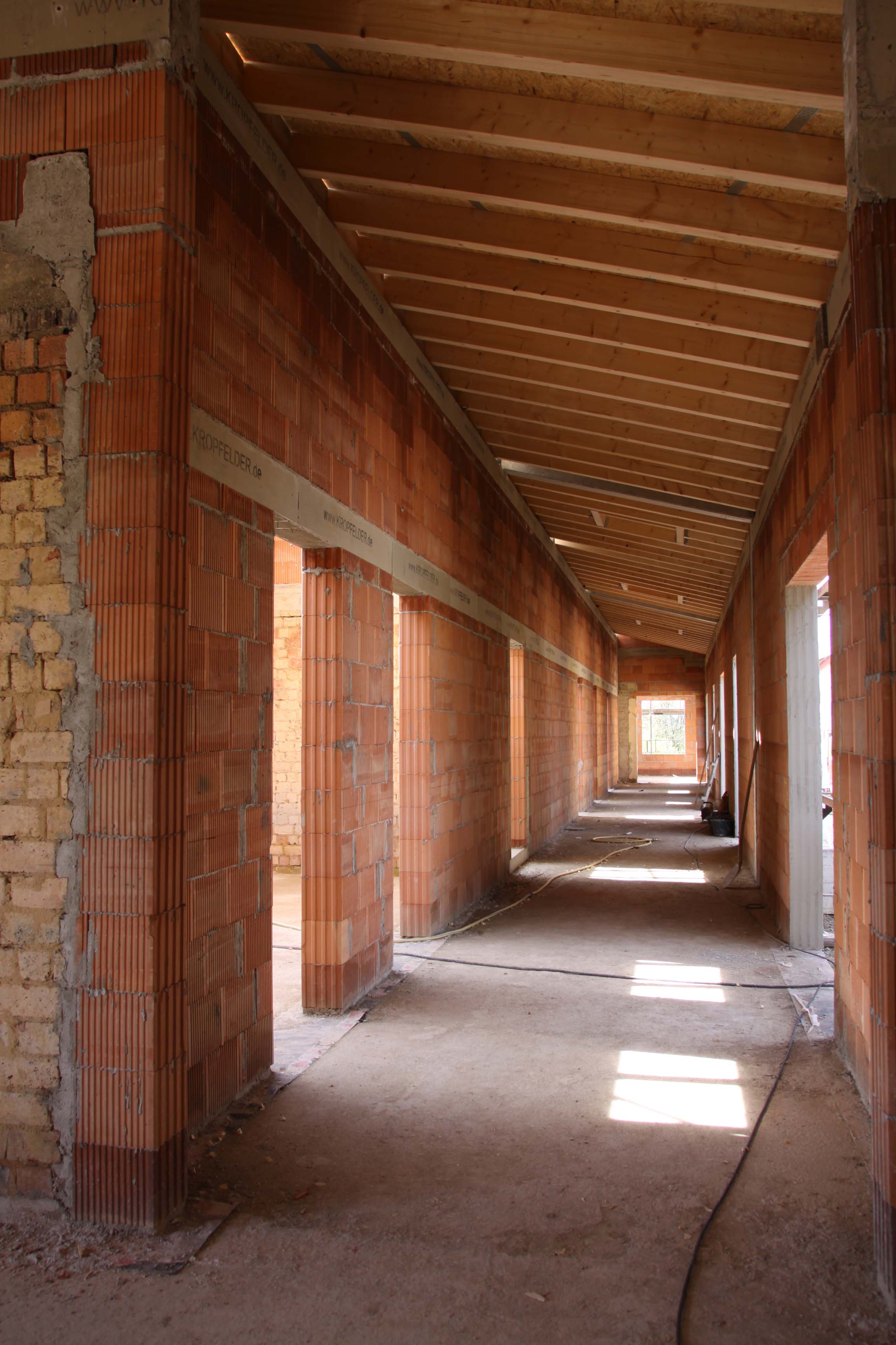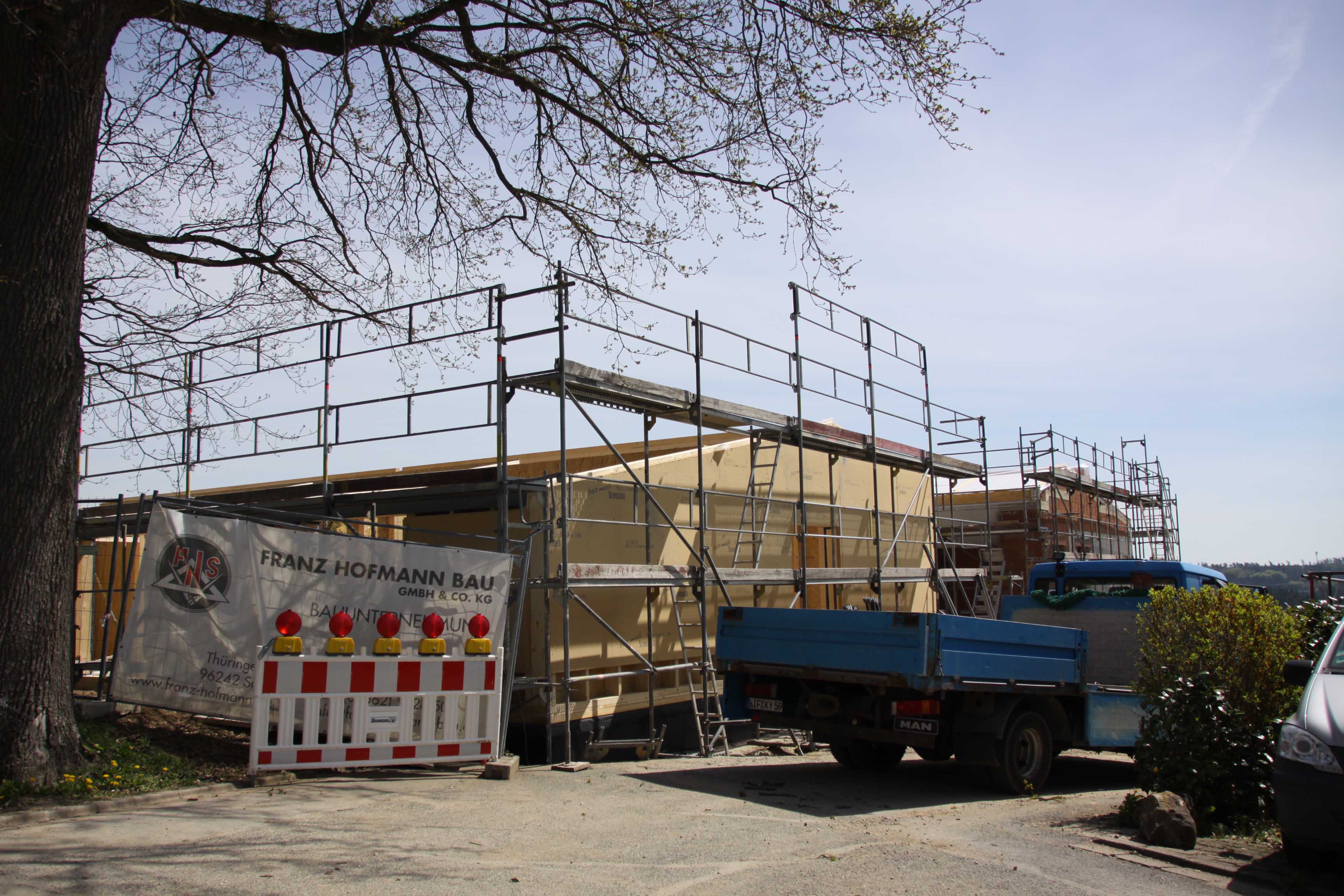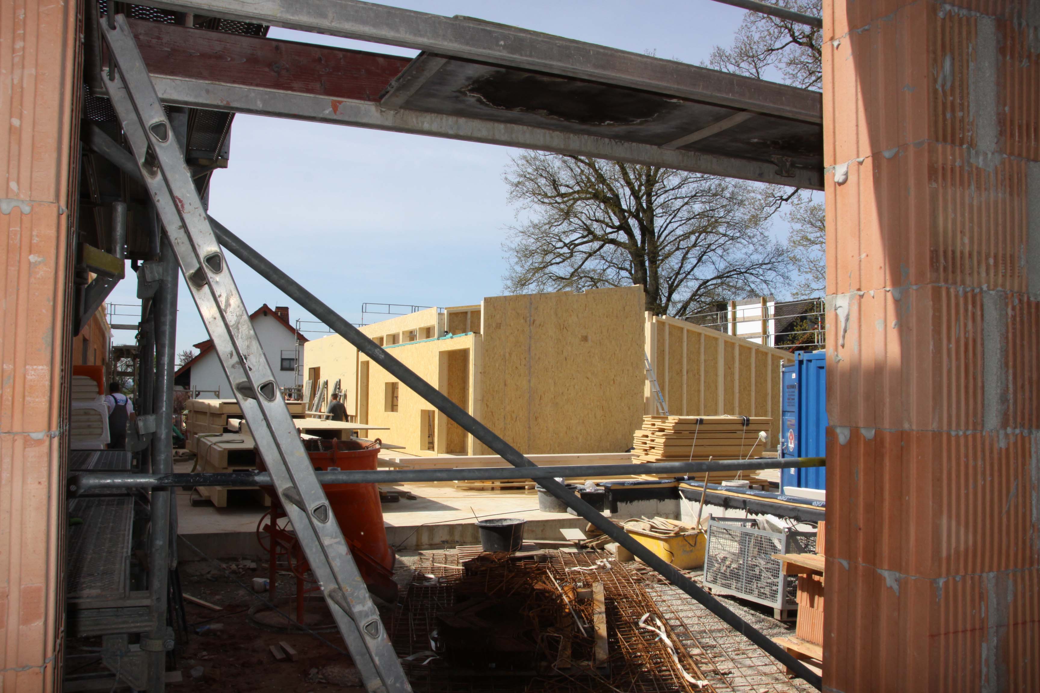 Lange war nur zu erahnen, was sich im Bereich des Eichenwegs so tut. Die Baumaßnahmen im Bestand hielten für den Bauleiter und die beteiligten Firmen einige zeit- und arbeitsintensive Überraschungen bereit. Doch nun geht es mit großen Schritten voran. Im Bereich des Altbaus wurde fleißig gemauert und aufgrund der durchwachsenen Witterungsverhältnisse ein Behelfsdach angebracht. Auch der Neubau, der in Holzständerweise errichtet wurde, ist schon fast komplett.