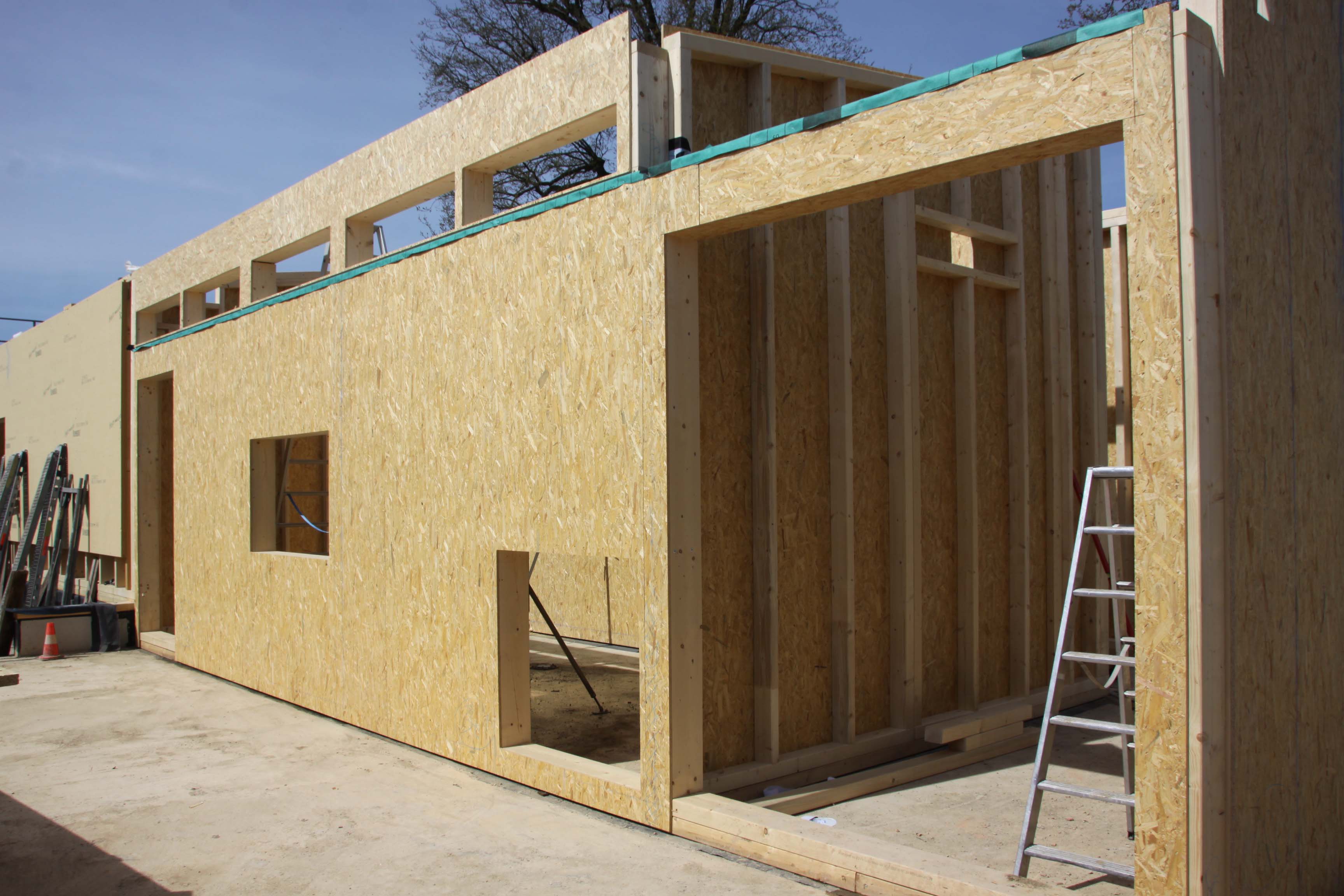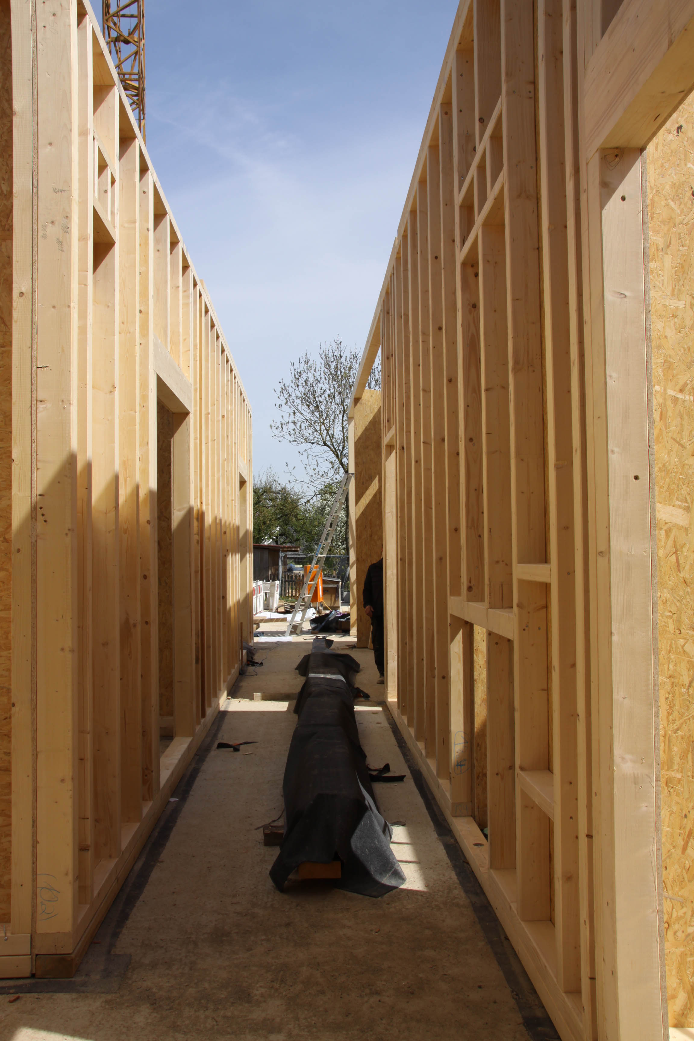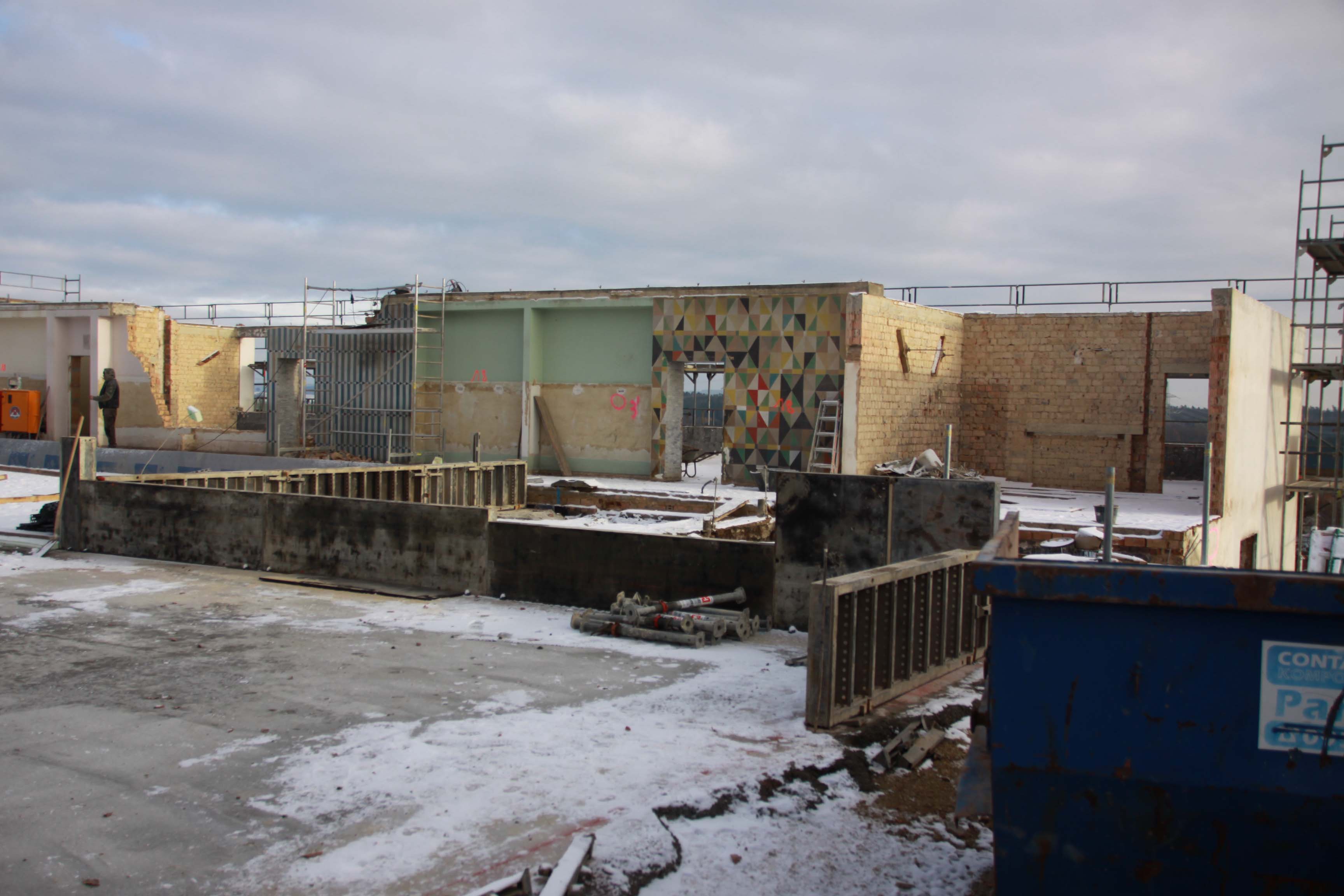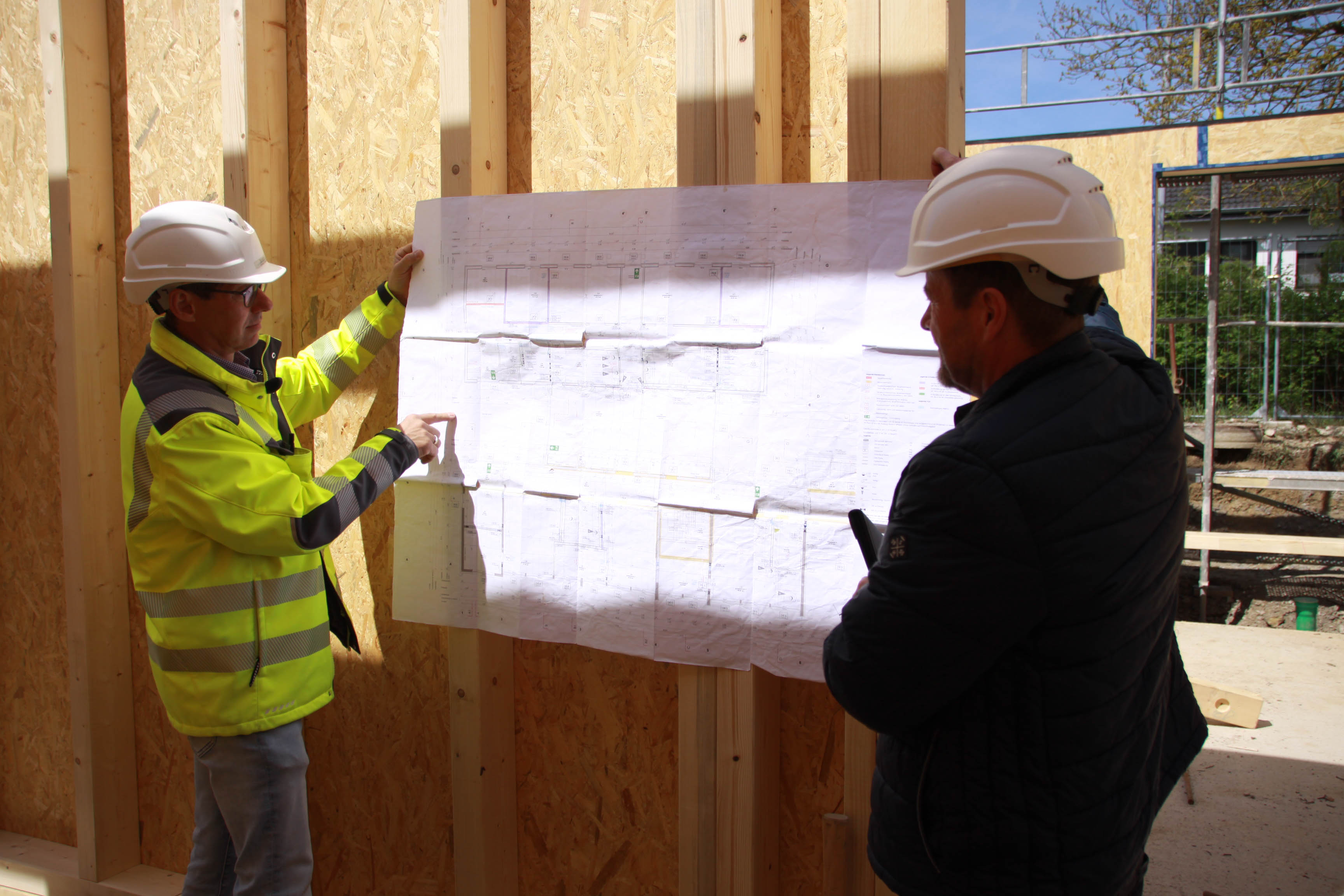 Lange war nur zu erahnen, was sich im Bereich des Eichenwegs so tut. Die Baumaßnahmen im Bestand hielten für den Bauleiter und die beteiligten Firmen einige zeit- und arbeitsintensive Überraschungen bereit. Doch nun geht es mit großen Schritten voran. Im Bereich des Altbaus wurde fleißig gemauert und aufgrund der durchwachsenen Witterungsverhältnisse ein Behelfsdach angebracht. Auch der Neubau, der in Holzständerweise errichtet wurde, ist schon fast komplett.