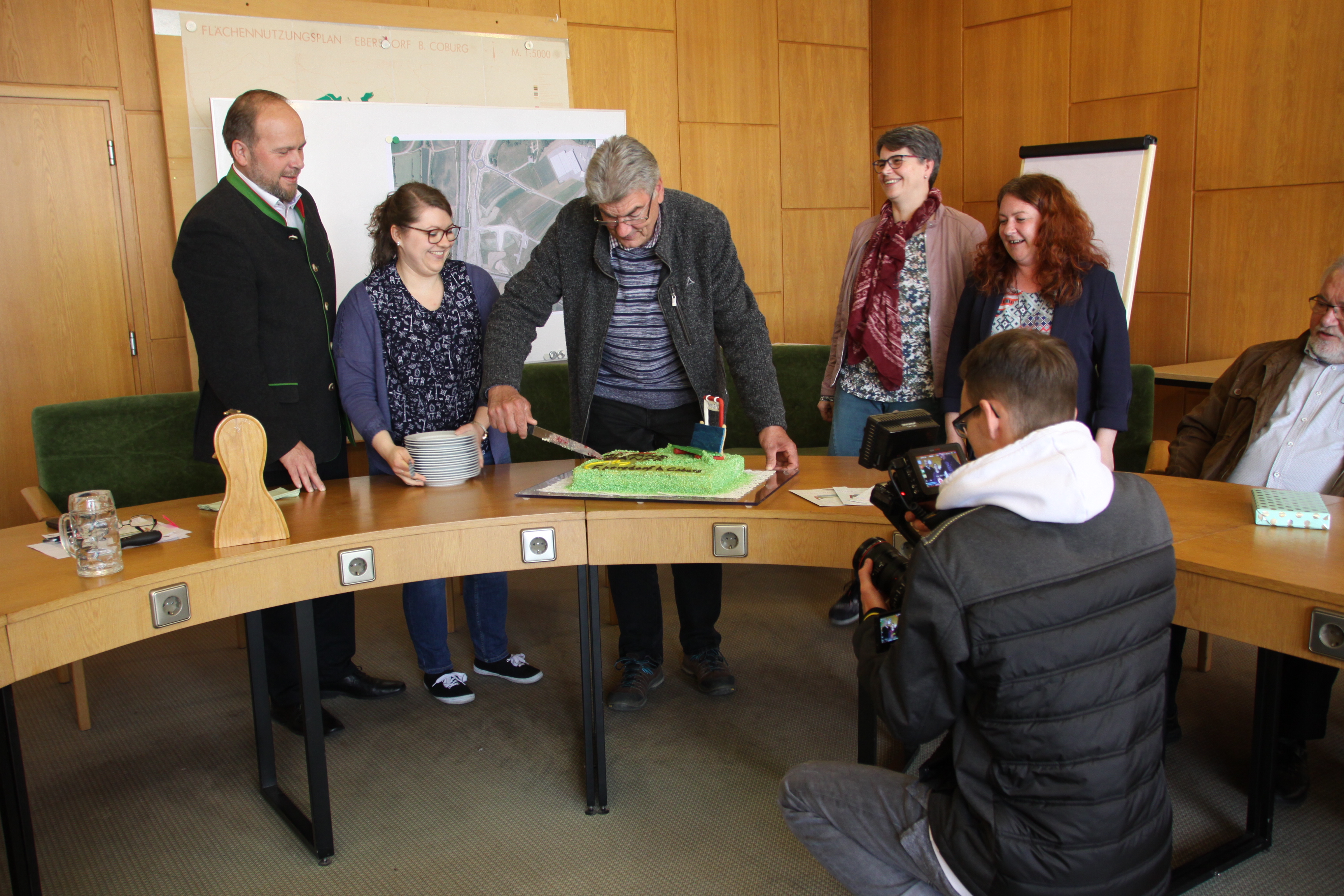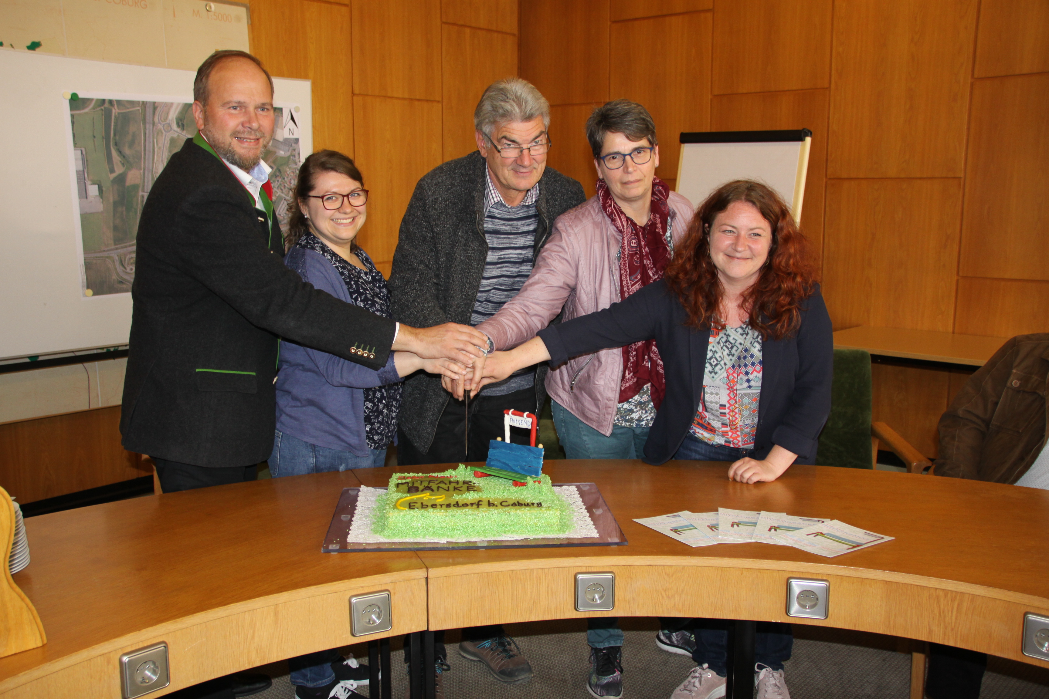 Am 15.05.19 war es endlich soweit: die Mitfahrbänke in der Gemeinde Ebersdorf b.Coburg wurden offiziell eingeweiht. Zu einer kleinen Feierstunde trafen sich im Sitzungssaal des Rathauses die Initiatoren, Mitwirkenden der Projektwerkstatt, sowie Spender und Unterstützer des Projekts. Bürgermeister Reisenweber bildete in seiner kurzen Ansprache die wichtigsten Stationen auf dem Weg bis zur Installation der Mitfahrbänke ab. Angefangen beim Antrag der Bürgergemeinschaft Ebersdorf, der das Projekt in den Gemeinderat brachte. Schnell fand es in den Seniorenvertretern gute und tatkräftige Unterstützer und es bildete sich die Projektwerkstatt Mitfahrbänke, bestehend u.a. aus Bernd Carl, Nadine Jakob vom AWO-Bürgertreff und Sozialmanagerin Danica Faber von der Gemeinde Ebersdorf. Ihnen war es dann, zusammen mit Frau Nuber vom Demographie-Kompetenzzentrum Oberfranken Offensiv, auch vergönnt, die extra angefertigte Torte anzuschneiden.
