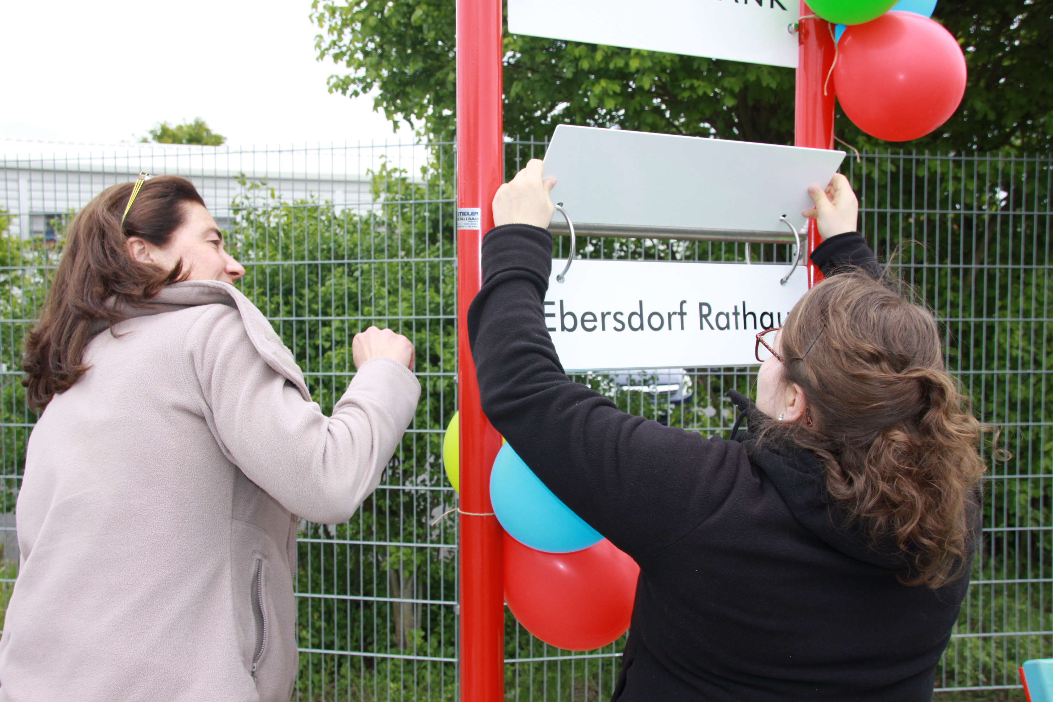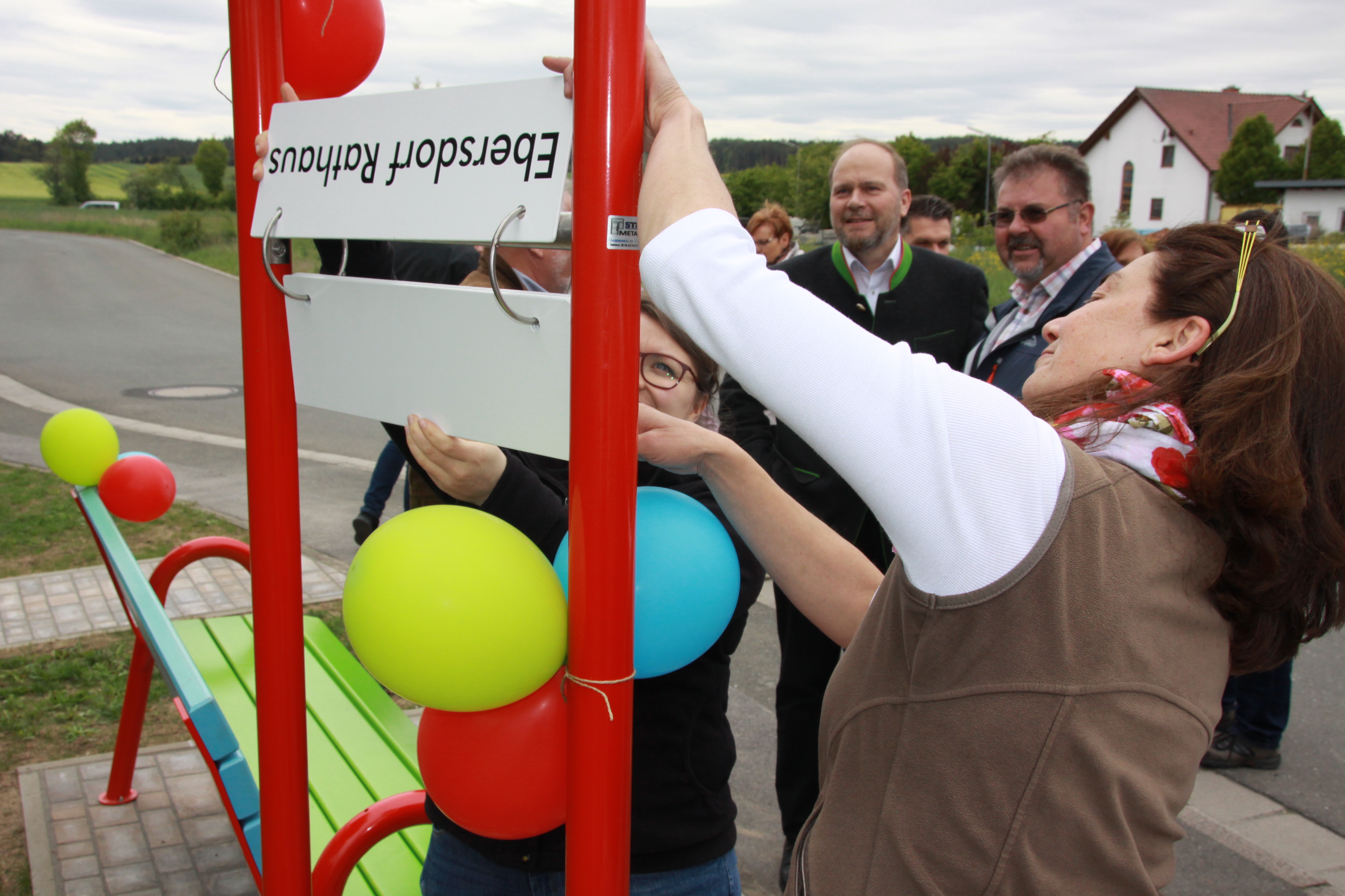 Frau Nuber teilte in diesem Zusammenhang mit, dass mittlerweile oberfrankenweit insgesamt 130 Mitfahrbänke bestellt bzw. ausgeliefert wurden. Den Startschuss gab Oberfranken Offensiv im Juli 2018 mit der Verlosung von 40 Mitfahrbänken. Auch die Gemeinde Ebersdorf b.Coburg ist ein glücklicher Gewinner eines Sets von zwei Bänken im markanten blau-grünen Oberfranken-Look. Eine davon steht nun in der Coburger Straße, Ecke Schlesierstraße, wo sich anschließend alle Beteiligten von dem Schildersystem überzeugen konnten.