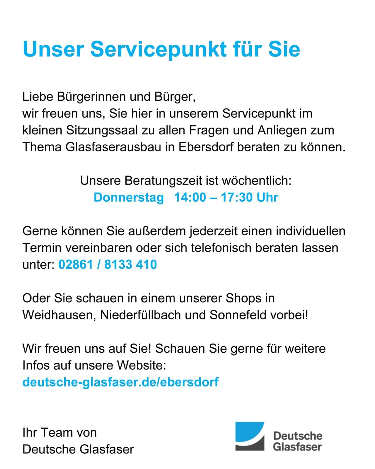 Deutsche Glasfaser ist als Innovator und Pionier der Branche ein erfahrener und wirtschaftsstabiler Partner der Kommunen. Mit weiterhin hoher Ausbaugeschwindigkeit wird das stabile Wachstum als Digital-Versorger für den ländlichen und suburbanen Raum fortgesetzt. Alle abgeschlossenen Vorverträge behalten ihre Gültigkeit. Es besteht kein Handlungsbedarf für die Bürger. Deutsche Glasfaser informiert, sobald es neue Entwicklungen gibt.“